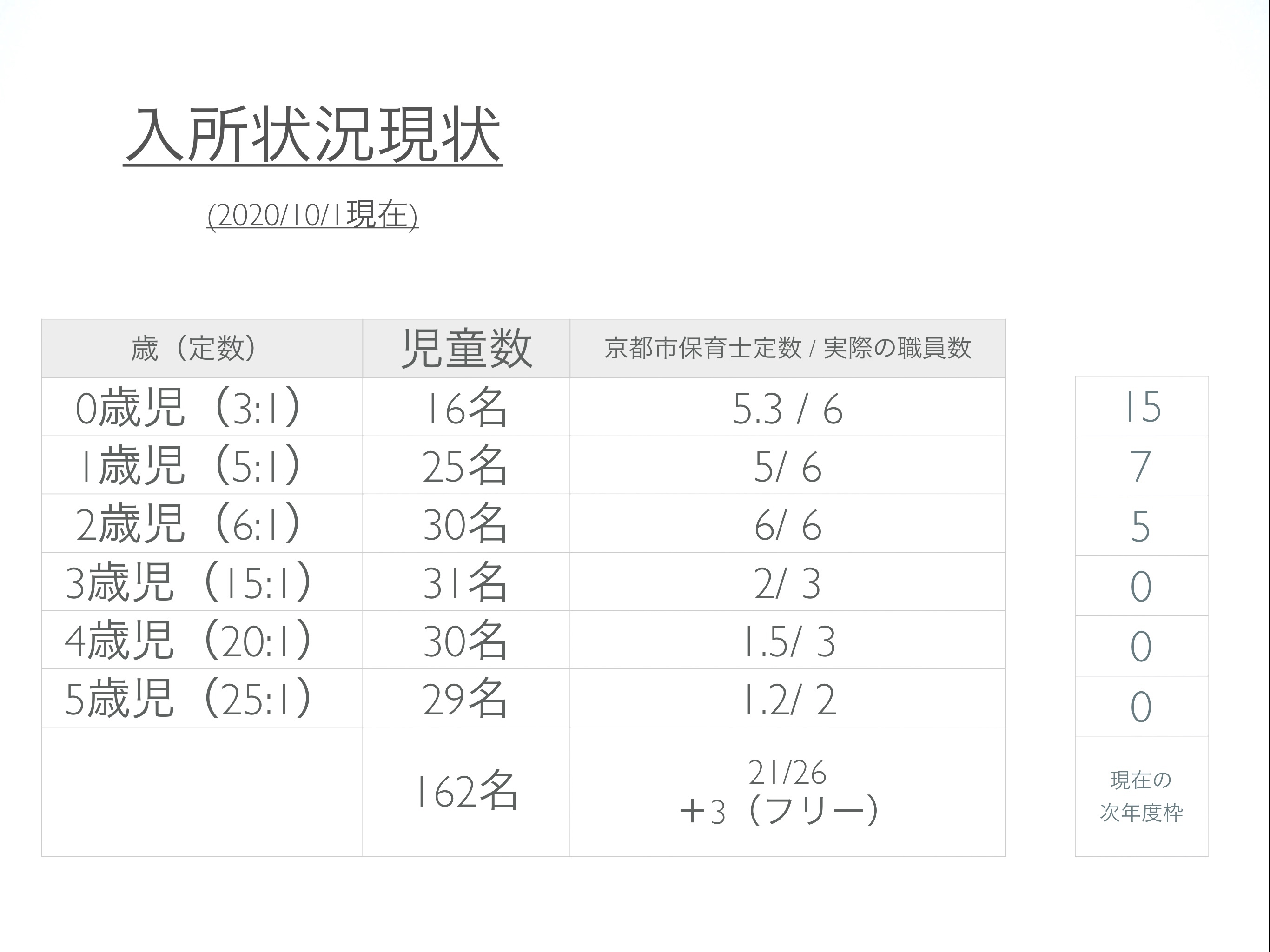 A.新年度4月の予定枠は0歳児:15名、1歳児:7名、2歳児:5名、3~5歳:若干名です。途中入所の受付は随時行っていますが、保育士定数との兼ね合いで受入れ可能かはその時の状況次第となります。転勤による転園も多い地域ですので、倍率や入りやすさの状況はその都度変わります。